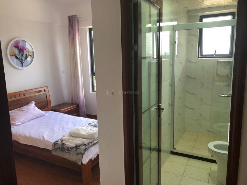 • Ensuite master bedroom with built-in closets, WC, a hand wash basin, shower cubicle with showerhead, and a large balcony