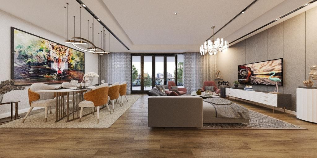 Voluminous lounge and dining leading to large terrace.